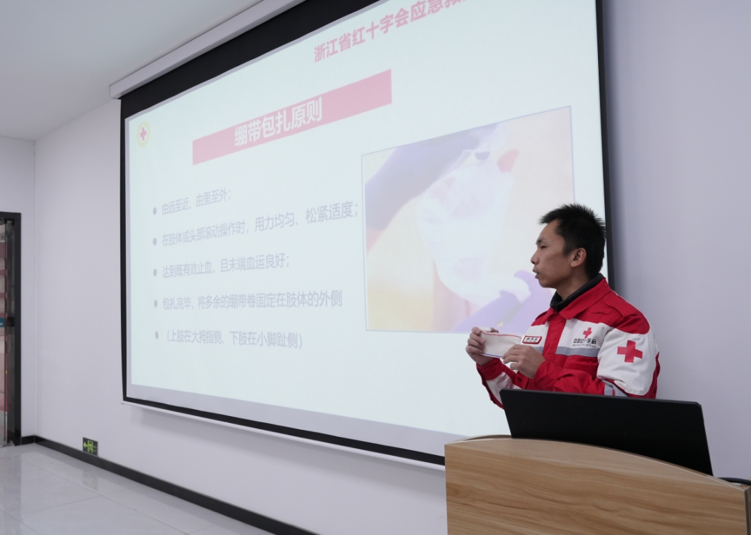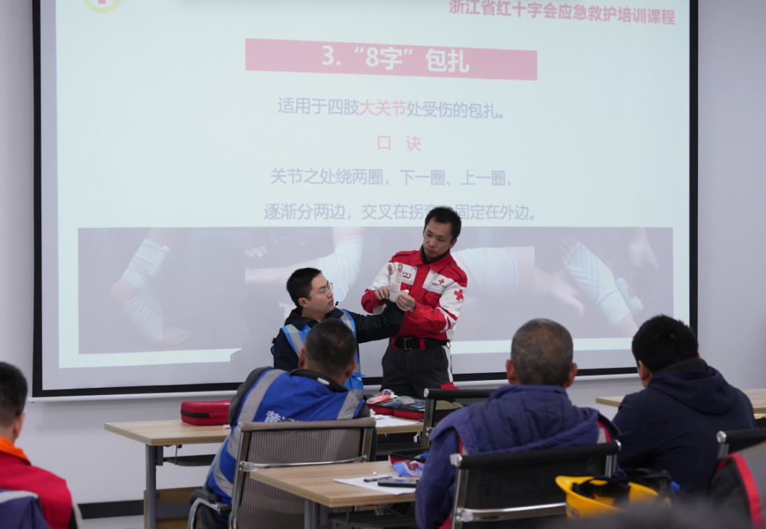 培训现场,平阳县红十字会的专业讲师身着醒目的红十字志愿服,采用理论讲解与实操演练相结合的方式,为学员们带来了一场生动实用的急救课。课程内容涵盖创伤止血包扎、三角巾头顶帽式包扎以及心肺复苏等核心急救技能。
